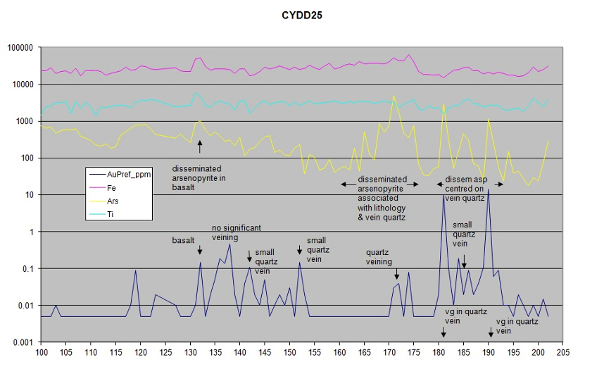 Down hole multi-element chemistry produced by ICP-MS analysis with anotated geologic features correlating with geologic features and ore mineralogy.